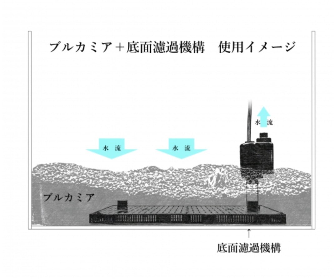 設置方法はとても簡単で、フィルターとポンプを敷き、ブルカミアを約5から6㌢の厚さで敷き詰め、注水して12時間循環させれば生体を迎え入れられます。
